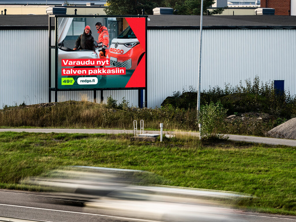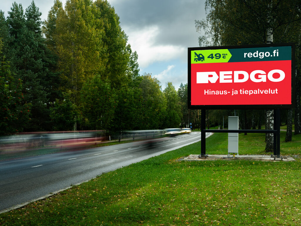 REDGO palvelee tiellä liikkujia, joten tienvarsilla näkyminen on luontainen valinta. Digitaalinen ulkomainonta mahdollistaa mainonnan sisältöjen ja sijaintien kohdentamisen sesonkiaikoina.