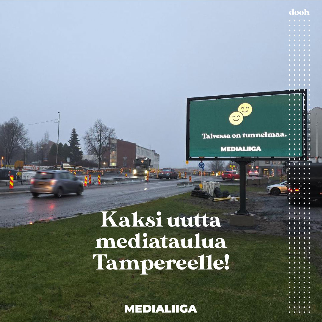 Medialiigan Pirkanmaan mediatauluverkosto on laajentunut kahden uuden valovoimaisen kohteen voimin. Näyttävät 10 m² kokoiset mediataulut sijaitsevat Tampereen eteläpuolella Sarankulmankadulla, sekä itäpuolella Messukylänkadulla. Uutuuksien myötä mediatauluja löytyy Pirkanmaalta jo 30 kappaletta.