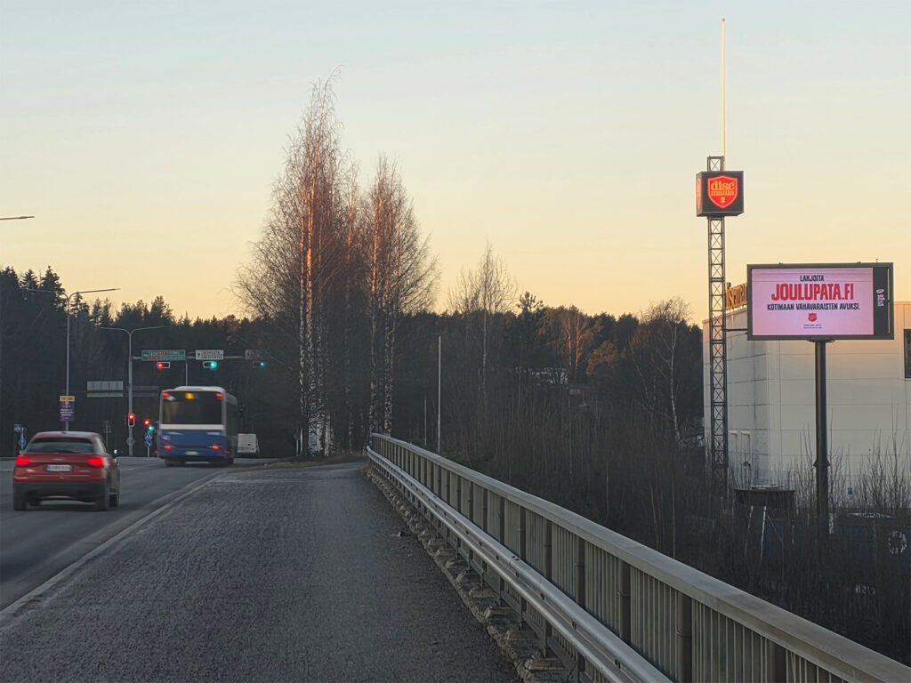 Messukylänkadun kohde sijaitsee vilkkaan väylän varrella paikassa, jossa muut häiriötekijät ovat vähissä. Korkealla sijaitseva mediataulu kiinnittää tehokkaasti huomion. Mediataulu tavoittaa Kangasalta ja Kaukajärveltä Tampereen keskustaan tai muutoin länteen suuntaavaa liikennettä. Kaukajärven päivittäistavarakauppojen keskittymä on aivan kulman takana. Tutustu tarkemmin täällä.